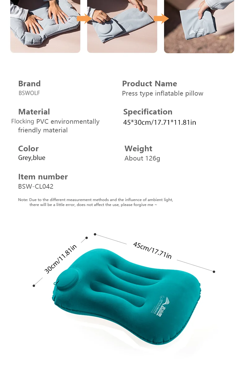 The BSWOLF inflatable pillow is perfect for camping, hiking, travel, and outdoor adventures. Ultralight and portable, it provides comfortable support for your neck and lumbar area, ensuring restful sleep anywhere. Easy to inflate and deflate, it’s ideal for long trips and outdoor activities.
