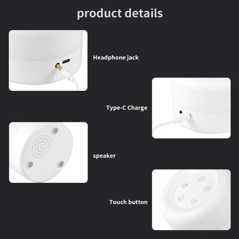 Perfect for nurseries, bedrooms, or travel, this device is battery-operated and USB rechargeable for convenience. Its sleek design fits any décor, making it both functional and stylish.