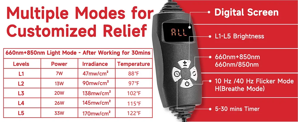 Choose from four modes: 660nm red light, 850nm near infrared light, 660nm+850nm mode. Each mode offers 5 adjustable brightness levels for optimal effectiveness. Perfect for sports injuries, stiff neck and shoulders, back pain, muscle soreness, and tissue repair.